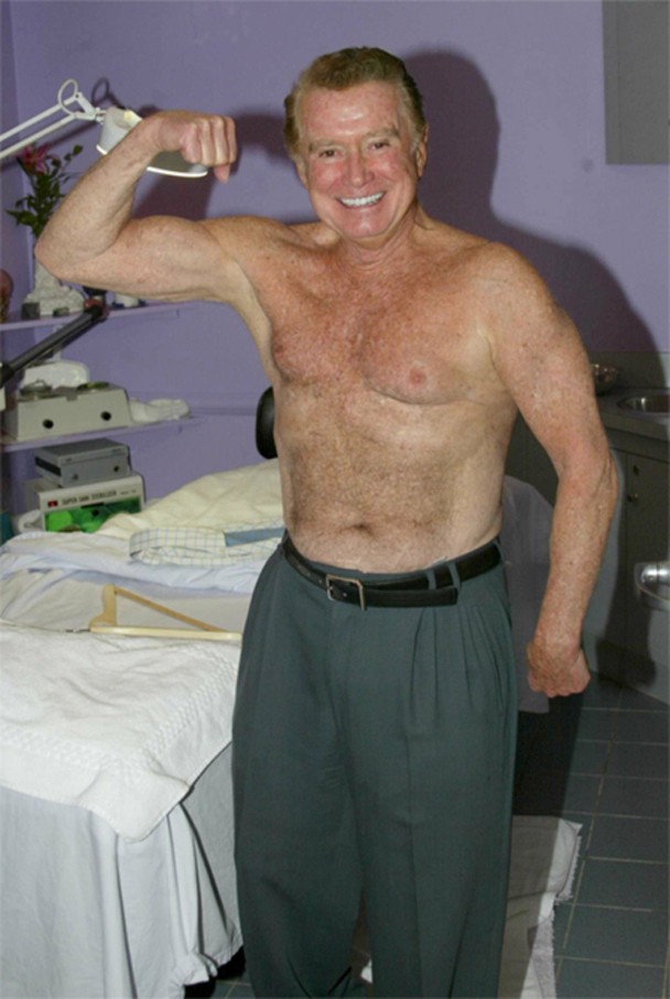 HELLO, LADIES! Right? Right, ladies?! SEX! SEXY! It's not necessarily weird that Regis Philbin allowed his picture to be taken shirtless wearing only the finest pleated slacks. He's a very famous celebrity! I'm sure people are asking to take his picture every five seconds, and every once in awhile, his body has no shirt on it. That's just life. Celebrities are just like us! Every once in awhile they do not have a shirt on right before they put a shirt on. What is weird is that this photo was DEFINITELY taken in a hospital room. Again, it's NOT weird that Regis Philbin is in the hospital. I'm pretty sure he visits the hospital almost as often as someone asks to take his picture. He's 1,000,000 years young! OK, fair enough, now that I think about it, this is just a perfect storm. If every five seconds Regis is asked to have his picture taken, and every five seconds Regis is at the hospital, then it once more follows that at some point he is going to have his shirt off also. THIS IS LIKE AN S.A.T. PROBLEM! Please provide your answer in the form of a caption.