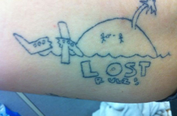 WarmingGlow claims that this is the crappiest Lost tattoo ever, which a) presupposes that he has seen ALL of the Lost tattoos in the world, which I doubt, he is just one man blog, and b) completely overlooks the fact that this is actually the BEST Lost tattoo ever. Duh.