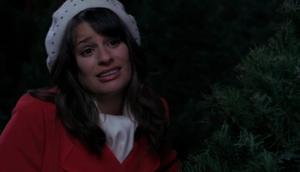 Rachel’s desperate to win Finn back after begging Puck to fuck her (and getting reject-o-ed) last week (ish?), so she’s created a “winter wonderland” on the stage of McKinley’s auditorium, just for him. Then she gives him a gift certificate for one song of his choice to be screamed by her directly into his face—that gift is SO Raven Rachel. Anyway, this whole plan doesn’t work—Finn bitches about the artificial trees Rachel used in her “winter wonderland” set (ape need real tree in habitat), and declines the scream-offer right to Rachel’s ever-quivering mug. But, Rachel is Rachel, and her overlords on the writing staff don’t want to give her one second of fine-ness this season, so she’s like “THE SHOW MUST GO ON” (nope, no it doesn’t), and then screams “Merry Christmas, Darling” into the void: