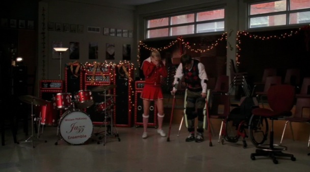 After their screaming, the Gleetards come back to the Gleehearsal room to find Brittany the Perfect and Artie waiting for them. When those two got back to Brittany the Perfect’s house, they found a Re-Walk under the tree, which is an actual invention by an actual Israeli that actually allows actually handicapped people to actually walk around. They have no idea how it got there—Brittany the Perfect’s dad was “taking a long poop” (LOLOL finally) and it just appeared under the tree!!!!
