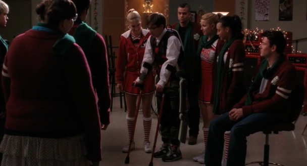 Sue’s got another surprise: all the Gleetards are there too, and they’re gonna help do whatever at their teacher’s house on Christmas. Very cool!