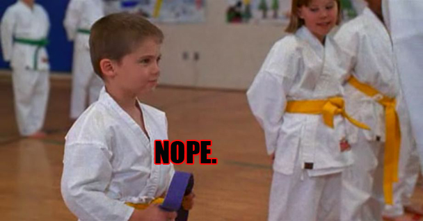 In the first 10 minutes of Jingle All the Way, before we even get into the slapstick, crime-laden, immoral plot, we learn that Arnold Schwarzenegger is a negligent father who doesn't spend enough time with his family because he's too busy running a successful...mattress company? Honestly, there is one scene during the opening credits in which we see Arnold Schwarzenegger at work, and he says the word "mattresses" and there are mattresses visible in the background, but it is never made explicitly clear what, exactly, his business is, or why it's successful. After he leaves the office, it is never mentioned again, which is actually pretty surprising if he's really supposed to be so obsessed with his work to the detriment of his personal life. But that's actually not the issue I want to talk about. The issue I want to talk about is how the reason we know he's a bad father is because he misses his son's karate class where his son was promoted from a yellow belt to purple belt. Um, no he didn't. Because that's impossible. Later, the son angrily complains to his dad that he also missed his promotion from blue belt to yellow belt. Again, no he didn't. Obviously, in a movie so riddled with HUGE and GENUINELY OFFENSIVE problems, it's probably a waste of energy to get so mad about something like this, but there is literally not one single martial arts system in the entire world that functions on a belt system that goes from blue to yellow to purple. Even people who don't know anything about karate know that yellow belt is a bullshit belt. The point is: if you're going to make the super-specific choice to make the ONE DETAIL we EVER LEARN about this LITTLE BOY'S ENTIRE LIFE, his DEFINING CHARACTERISTIC BEING A MILD INTEREST IN MINNESOTA KARATE CLASS, at least do five minutes of research and get the details right. GOD DAMN IT. Seriously. Like, trust me, Jingle All the Way, you're going to get a lot more things wrong in the coming hour and a half, it would be in your interest to get a couple of victories under your belt.