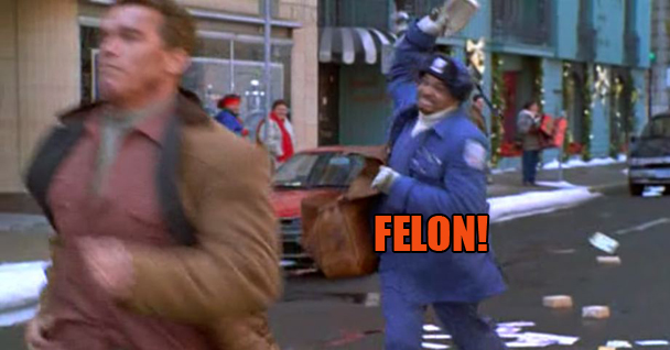 The rest of the movie is a "madcap" adventure in which Arnold Schwarzenegger makes ever more ridiculous attempts to find the elusive toy for his son (abandoning his family even more in the process), and also enters into a competition with another father played by Sinbad who also wants a Turbo Man doll. Like, to give you a sense of just how stupid it is, aside from all of the running and punching and slipping and pooping and farting and grunting, at one point they are both in a diner when they hear a radio announcer say that the first caller to name all eight of Santa's reindeer correctly will win a Turbo Man doll. The two men grapple for the payphone and end up, obviously, breaking the phone. But the waiter at the diner informs them that the radio station is just two blocks away. So they RUN TO A RADIO STATION and TAKE THE ELEVATOR UPSTAIRS and BANG ON THE WINDOW and at this point no one has called in with the correct answer (?) even though it's a pretty stupid question that even these two dopes know the answer to, and then there is another fight and also a BOMB. I mean, good God. Speaking of bombs, the movie has, by my last count, at least 10 serious crimes including assault, impersonating a police officer, domestic terrorism, breaking and entering, and cruelty to animals. Oh, and tampering with the mail.