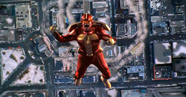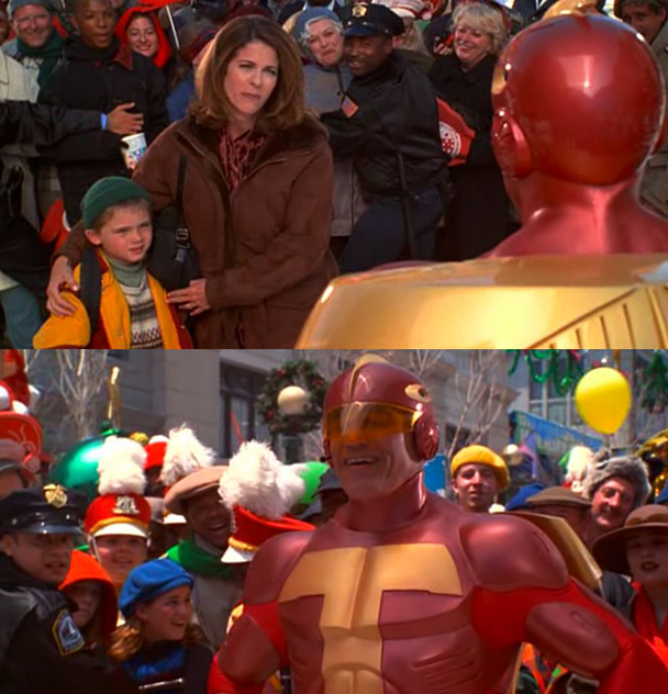 The movie's climax involves a holiday parade in which an entire city of people, adults included, cannot wait for a Turbo Man float to pass by. Seriously, like, adults are screaming "WE LOVE YOU, TURBO MAN!" I've only been to Minneapolis once, and it was during the summer, so maybe this is an accurate depiction of the city in 1996, but I hope you guys have worked that shit out by now. Of course, Arnold Schwarzenegger ends up in the Turbo Man costume, at which point Sinbad puts on the villain costume and actually chases the little boy up onto the roof of a building. Meanwhile, everyone is just watching? As a grown man attempts to actually MURDER A CHILD? What is even going on here? And don't get me started on this: