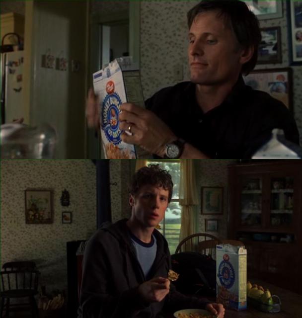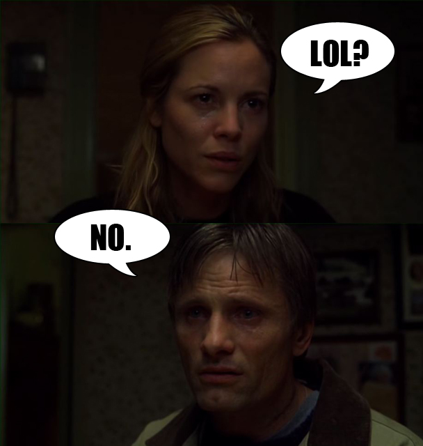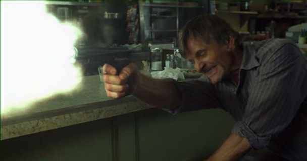 A History of Violence is based on a graphic novel that I haven't read, so if that colors your opinion of my opinion, fair enough, but I am just letting you know the truth right at the beginning. Speaking of beginnings (A History of Segues), the movie opens at a motel where there are some mean jerks doing terrible things. Yuck. Totally hate these dudes! They are on a cross-country murdertrip, which eventually brings them to Small Town, Indiana, and into a Perfect Little Diner (I think that's actually the name of it) run by mild-mannered Tom Stall (Viggo Mortensen). When they start getting real rapey and gun-pully, Viggo Mortensen smashes them in the face with coffee pots, and blows their brains out. One of them goes flying through a plate glass window. Now Viggo Mortensen is on the news because that is where American Heroes are. The next day, ANOTHER mean jerk shows up. He might be one of the Men in Black? Except that he's trying to get people to REMEMBER things instead of FORGET them. Namely, he wants Viggo Mortensen to remember that his name isn't Tom Stall at all, but actually it is Joey Cusack, a notorious mobster from Philly. He makes everyone very nervous with his scarred up face and his goons and his attitude in general. When he tries to kidnap Viggo Mortensen's son in order to coerce him into coming back to Philly (where he will presumably be killed), Viggo Mortensen kills everybody on his front lawn (well, and his son kills one of them, which is pretty chill) and that is how his wife learns that she is married to a liar. They have some very aggressive sex on the stairs. Yowza. Tired of being in the doghouse with his wife (don't you guys hate it when wives won't let you lead a double life as a murderer?) Viggo Mortensen goes back to Philly to confront his mob boss brother, and by confront I mean kill. He takes his shirt off and stands by a private pond and thinks about stuff. Then he drives home to his wife and children and sits down at the table with his eyes all puffy and no one says anything and Viggo Mortensen and his wife look at each other. Do you remember how at the end of Knocked Up you're not really sure whether or not Katherine Heigl and Seth Rogen will stay together? It's like that. But NO LAUGHING.