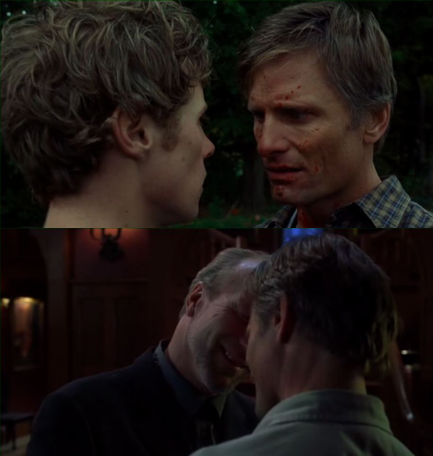 This seems like a perfectly textbook reading of the movie, although I'm not really sure this kind of trick is ever even possible to pull off. The problem with condemning an audience for its bloodlust is that in order to do so you have to give the audience exactly what it wants, and so the audience remains unchastened. If, as Manohla points out elsewhere in her review, the violence in this movie is ALSO exciting, then its deconstruction and/or criticism of how/why we are excited by violence seems kind of moot. To quote her, we are, therefore we are. But so, whether it proves its thesis or not, it's actually an entertaining to watch. The college kids can have their Marxist interpretation of the film's exploitation, I just like the part when Viggo Mortensen breaks that dude's arm using his armpit! BOOM! Look out for the garrote!