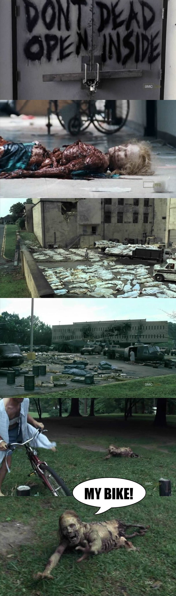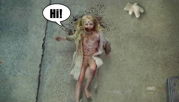 Grimes steals a zombie's bike and goes home, but his wife and child are nowhere to be found. Maybe they're on their way to the hospital to visit you for the first time? Wouldn't that be funny? "I can't believe we left for the hospital five minutes before you came home. Hahaha. Ships in the night!" Just kidding, THEY'RE DEAD. Grimes cries. Grimes gets hit in the head with a shovel by our generation's Walt. WALLLLLLLLLLT!