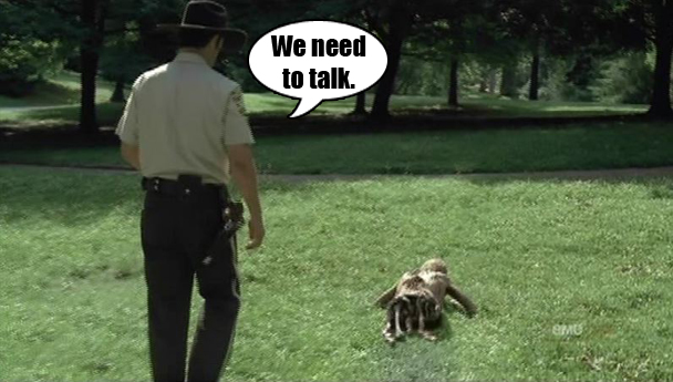 He heads to Atlanta to see if it is true that there is a huge, military-protected refugee center and also his wife and child. Something tells me none of those things are there. It's interesting that zombie movies (and TV shows) take place in an alternate universe where the zombie virus is real and where no one has ever actually seen a zombie movie. Anyway, Grimes is cruising along making I Am Legend announcements on the bandwidth. There is a group of humans who hear him, but they can't get the radio to work. Also, one of those humans is his former partner and two of those people are his wife and kid. I know that the Zombie Apocalypse is going to be very stressful, or whatever, but you would think that perhaps one of the THREE CLOSEST PEOPLE in Grimes's life might recognize his voice. Most notably, his partner, Shane, whose professional life involved lots of radio discussions with Grimes would recognize his voice. Oh well, whatever, no biggie. I'm sure they'll all laugh about it later, right after they're done laughing about how Shane has straight moved in on Grimes's wife two days after the Zombie Apocalypse started. "I thought you were dead. It's been hours!"