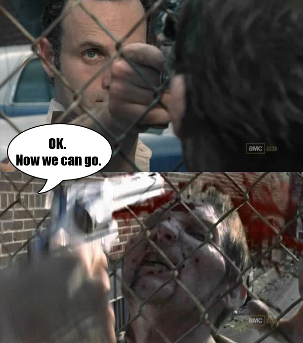 Morgan and Grimes go their separate ways, for now. Oh wait, hold on, Grimes just has to shoot this dude in the head.
