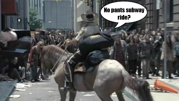Grimes gets a horse (long story) and makes it to Altanta (surprisingly short story). Seems like a good idea. What better place to be during an apocalyptic Zombie Crisis than a major city? "I was top of my class in Common Sense at boot camp," is what Grimes always tells everyone. "I'm going to visit Zombie Coke World!" At first everything seems pretty chill. Just a couple of zombies on a crosstown bus. But then Grimes turns a corner and WHOOOOOOPS, looks like all the zombies heard about the new Improv Everywhere mission but Agent Grimes didn't get the text blast.