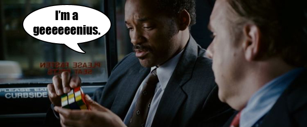 The movie also does one of my least favorite things, which is to establish a character's intelligence through the use of a fucking prop. Chris Gardner, for example, is a math genius. We know this because he can solve a Rubik's Cube puzzle. SUUUUURE.
