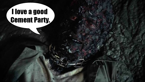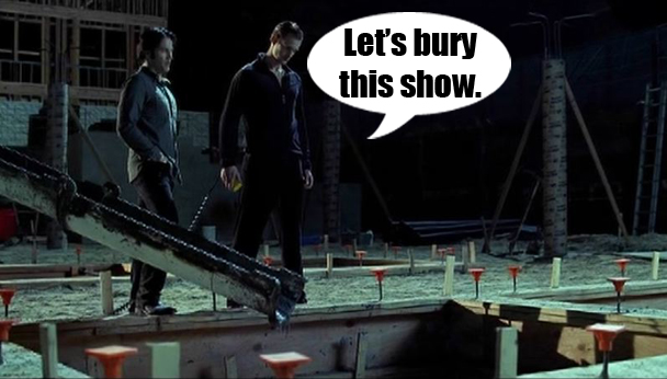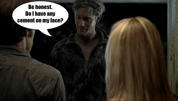 Alcide comes to the Vampire bar to protect Sookie. Bill gives him the eye. They give each other the eye. The Vampire King makes fun of Alcide for pretending to be a nice guy when he is a KILLER WEREWOLF, to which Alcide replies "RABBITS AND SQUIRRELS ONLY." Hahahhahahaha. Rabbits and squirrels, LADIES. "I wouldn't kick this guy out of bed for eating RABBITS AND SQUIRRELS." -- Your mom. Bill and Eric leave the bar to bury the Vampire King in cement for "100 years." Haha. Sure. That is a really tough threat when you are immortal, I'm sure. Also, what is that all about? Burying him in cement. Give me a break. But then Bill pulls a classic Switcheroo! and buries Eric in cement. Everyone is buried in cement now. CEMENT PARTY!