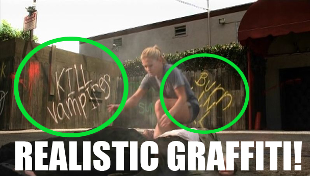 AND SO: Vampire Eric has silver-handcuffed (right) himself to Vampire King of Mississippi in the graffitoed parking-lot of Fangtasia so that they can die together and he will have his final revenge on the werewolf-lord who killed his Viking father 1,000 years ago. (My landlord really needs to appreciate what I do to ensure that he gets his money on time!)
