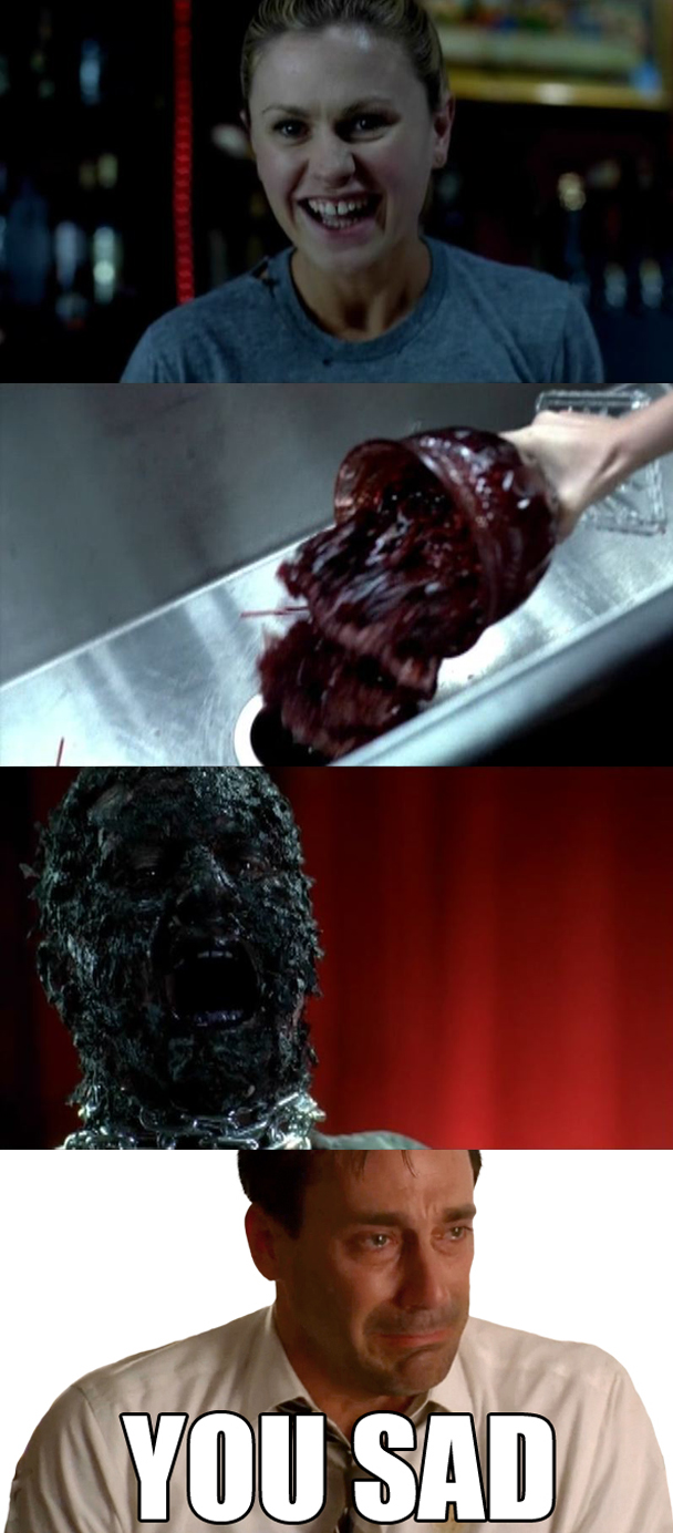 Bill float fights (?) the queen. Eric goes to wash his face. Sookie disappears in a magic graveyard fairy chandelier explosion. UGH. This show! BURY THIS SHOW IN CEMENT PLEASE. After the credits Alan Ball explains that they're already hard at work on season 4 and we are going to "learn where Sookie went." OH BOY! It's so sad that we have to wait a whole year for this show to return to television, you guys. So fucking sad. The saddest, probably. Blood tears.