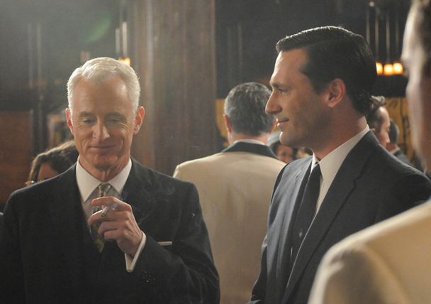 The final flashback shows Don and Roger waiting at the elevators. Don is like, "Hey dude! You hired me, dude!" Roger is like "I what?!" Because there was a time in our great nation when all business decisions were made during a blackout drunk. Which is good for these guys, because BOY do they like to DRINK and then SAY STUFF! These guys know what I'm talking about: