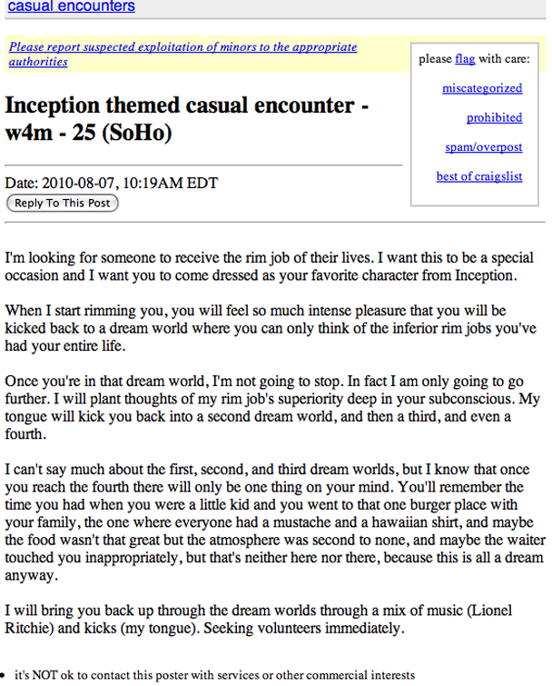 I have a feeling that this is fake (disbelief is my totem), but I wish it weren't. I wish there was someone out there having a really hard time finding willing partners for their excellent rim jobs, who realized that the overwhelming popularity of Inception was just the kind of marketing tie-in they needed. "Rim Jobs are through the roof in Q3! Great media partnership!" Interview in AdAge coming soon. (Craigslist via BuzzFeed.)