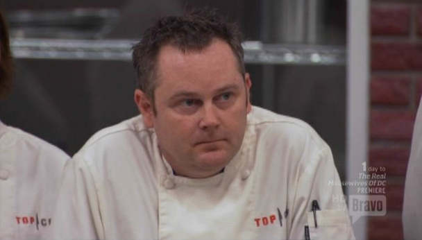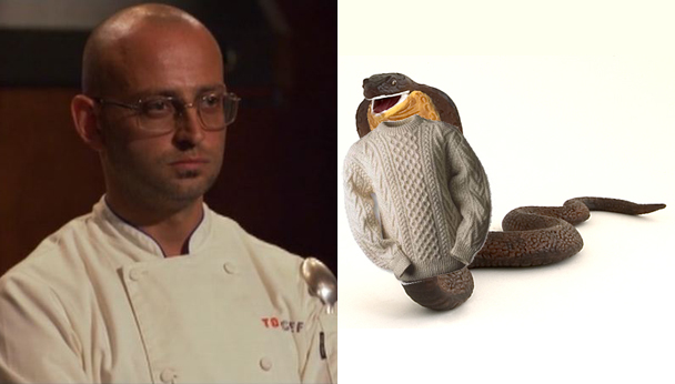 Not so nice: the judges did NOT like Alex's braised veal cheeks, jamon torta with olive & tomato salad, Ed's tea-smoked duck breast with pot stickers in szechuan jus, or Stephen's flank steak in chimichurri sauce with black beans & rice. Personally, I think Ed was just thrown in there because they needed three, and because Spanish General Tso over there didn't think it was authentic enough. But Alex and Stephen both definitely deserve to be up for elimination, as they have deserved to be up for elimination every week since the competition began. The producers' attempts at an Ed-Alex Showdown come to naught, but Alex does manage to look like a snake stuffed through a too-tight sweater.