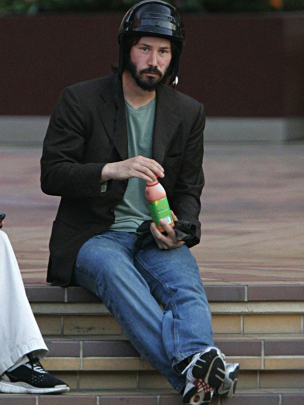 Oh brother. His face barely even looks dry from the last time. Well, here we go again, I guess. Internet, START. YOUR. PHOTOSHOPS. The helmet is a nice touch, though. If nothing else, it will allow the Internet to place Sad Keanu in increasingly dangerous situations without any danger of Sad Keanu injuring himself or his meme. Also, far be it from me to judge, but apparently not too far: what is going on with his outfit? Blazer over t-shirt, fine, whatever. Blazer over t-shirt with baggy mom jeans, OK. Keanu Reeves is a 52-year-old man, he has earned the right to be comfortable. But blazer over t-shirt with baggy mom jeans and brand new cross-trainers? Did he just get divorced or something? If he is a newly divorced dad out looking for studio apartments in the Loneliness Estates and Single Towers complexes out by the airport, then ignore my line of questioning. But if he is a very successful movie star with millions of dollars who knows that he is being followed by people with cameras hoping to catch him on an off-day to continue feeding the vagina-dentata of our celebrity culture, then, you know, whoops.