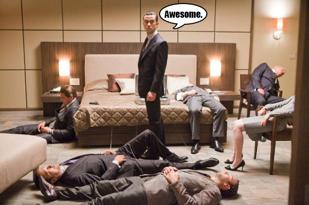 Gabe:the line of dialog that actually made me laugh the hardest was at the beginning: "What don't you want me to know, that you're trying to steal my secrets, or that we are still DREAMING" or whatever it was. I also did not like when joseph gordon-levitt was like, "paradox!" when he threw the guy off the hotel stairs. come on joseph gordon-levitt, back to work. you have things to do! here comes the kick!