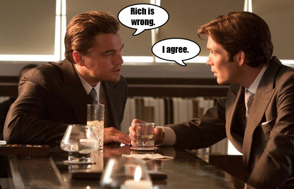 Rich:I was impressed that Nolan worked with the idea of creating and perceiving simultaneously, because that is exactly what happens when you dream. But then there was, "But there's something you still don't know about inception!" and "Oh, well, this is different because of all the layers so: LIMBO." And it was just like...OK?