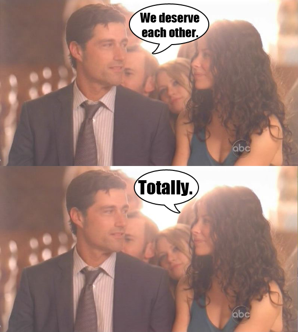 Anyway, at this point people are FEELING IT left and right. Sawyer and Juliette FEEL IT now. And Sayid FEELS IT because Sayid MADE OUT WITH SHANNON IN AN ALLEYWAY.