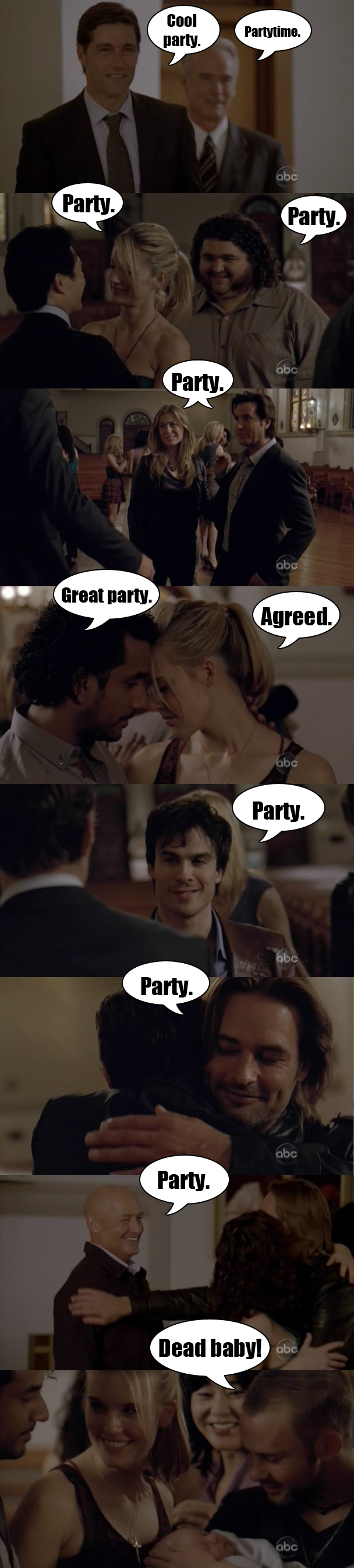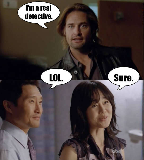 MEANWHILE, BACK IN BIZARRO LA: Detective Miles is at the Widmore party for some reason and sees Sayid waiting in the car while Hurley drops off Charlie, and so he calls Detective Sawyer and asks him to go speak to Sun in the hospital, not because that's a convenient way to get everyone grouped together. It's just really important that Sawyer go talk to Sun because of detective stuff. Even they are just like, "Sure, Sawyer."