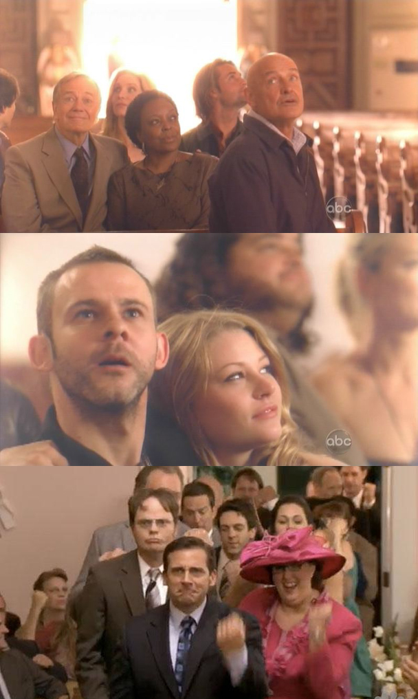The only one who's not really feeling it is Jack. He shows up at the concert, and Kate is like "Knowing looks," and Jack is like, "Don't know anything ever looks." She takes him to the church, you know, like how spinal surgeons who need to find their children at a concert will stop looking for their children and drive to a church with a total stranger. She says that she's going inside with everybody and they will all be there when he's ready. WAIT, READY FOR WHAT?! Oh man, you guys, this is it! Everyone is talking to each other outside of the church, and they are all being so SERIOUS and INTENSE. What kind of party is this? Lighten up you guys!!! Just kidding, you don't have to lighten up. It makes sense that this is SERIOUS and INTENSE. Appropriate!