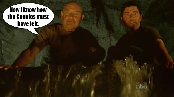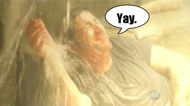 I don't mean give me a break about Hurley. Congrats, Hurley. You earned it. But give me a break about Jack knowing how to do that. I mean, seriously, Jack has been guardian of the island for two minutes, he let the light go out, the island is falling apart, and he's been stabbed. How is he Professor Island all of a sudden? I have a feeling that the only thing that just happened is that Hurley drank some river water and is going to break an axle and die of cholera, because Jack clearly has no idea what the hell he is talking about. But, so, Hurley is the boss of Ben. And Jack goes into the cave and puts the cork (ARGH) back in the island, and the light comes back. HELLO, LIGHT!