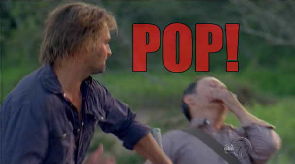 Sawyer gets caught right away spying on Locke and Ben at the well. To be fair, he's a con artist, not a hiding artist. Locke asks if he knows what he's up to, and Sawyer is like, "I'm guessing you're trying to find Desmond to destroy the island." Hahahaha. OK, so Sawyer knows EXACTLY what Locke is up to. Because that was an incredibly good guess. Locke tells Sawyer that all of Jacob's candidates are going to sink into the ocean with the island. Sawyer is like, "we aren't candidates anymore." And then POP.