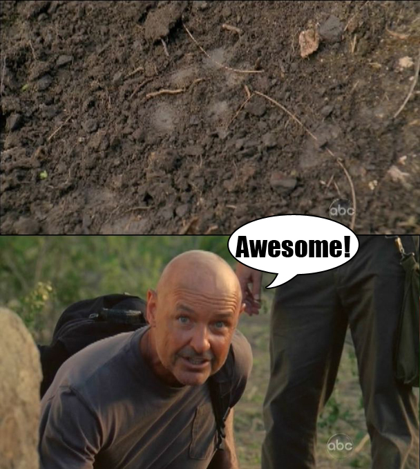 Bye guys! Hey Sawyer, don't forget your backpack! (You know a scene is dramatic and intense if one of the characters has a backpack.) When he's gone, Ben begins to cry, because Ben thought Locke was only going to destroy the island figuratively. Oh boo hoo. Sorry, Ben. It's weird how that immortal, paranormal, shape-shifting incarnation of pure evil kind of lied to you. Suddenly, Locke is distracted by something on the ground. What is that? Are those...are those PAW PRINTS?