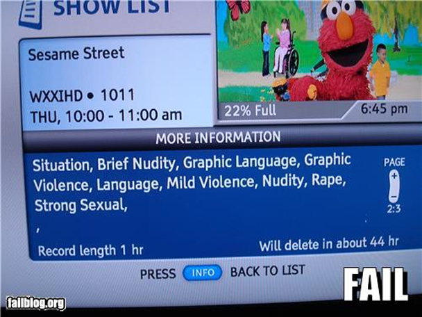 Today's entry in the Official United States Porno Switcheroo Archives Housed In The Videogum Library, however, is a rare forewarned Porno Switcheroo, in which a DVR description of Sesame Street informs potential viewers and engaged parents of the program's nudity and sexual violence: