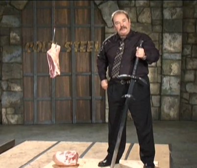 After the jump, I have posted an incredible, nine-minute-long video that I guess is some kind of infomercial for a "two-handed great sword" in which a group of chubby middle-aged white dudes, many of whom sport mustaches, take turns hacking at pieces of meat in a makeshift cardboard dungeon while public domain "hard rock" plays in the background. I just want you to know what you are about to watch! I would hate for you to click through and think that it was going to be an incredible, nine-minute long infomercial for a ONE-HANDED DAGGER in which a group of chubby middle-aged white dudes, many of whom sport mustaches, take turns hacking at pieces of meat in a makeshift cardboard dungeon while public domain "hard rock" plays in the background. Although, to be fair, that mistake would kind of be on you because you can't even cut a pig's face in half with a one-handed dagger. You're being ridiculous.