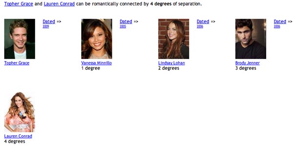 Similarly, the website "Who's Dated Who" proves with scientific reliability that Topher Grace and Lauren Conrad are sexually separated by only four degrees!