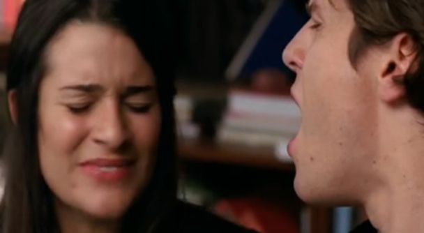 Sue tells Brittany-the-perfect and Santana to ask Finn out on a ménage-a-date, and he gets so excited that he dumps Rachel before the date even starts. Rachel’s SEXY MOUTH gives a speech about truly knowing people, or some shit, and then she sings “Hope it Gives You Hell” by The All-American Rejects (like Rachel’s ever even heard of that song/band). Meh. I woulda gone with some Alanis. But everyone else in Glee Club is programmed to appreciate her performance, because they all join in!