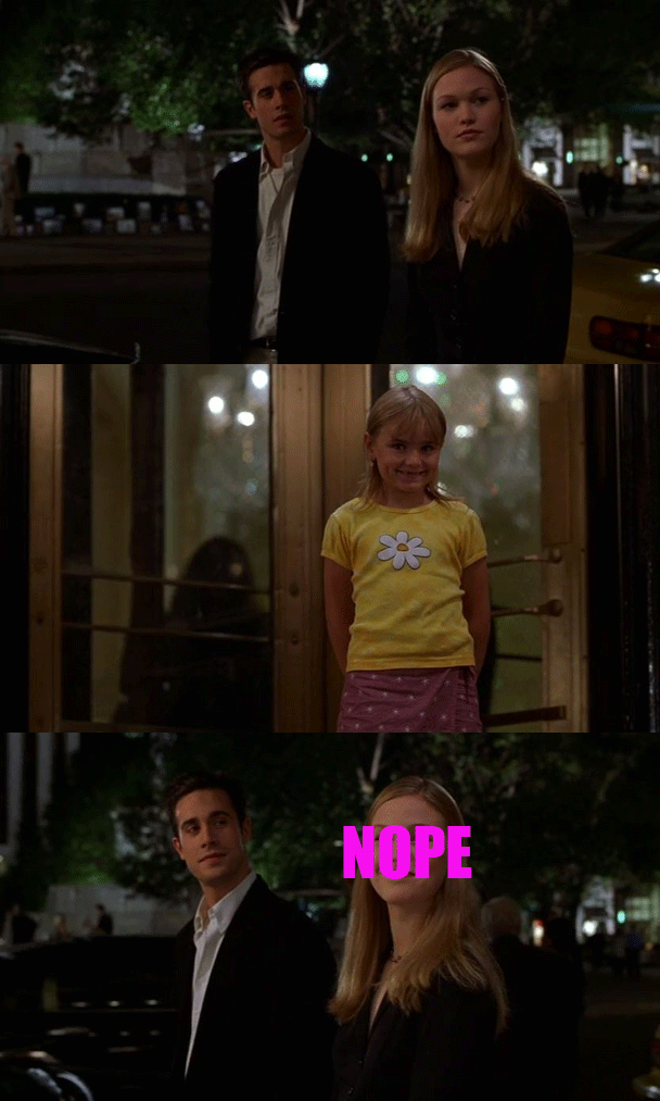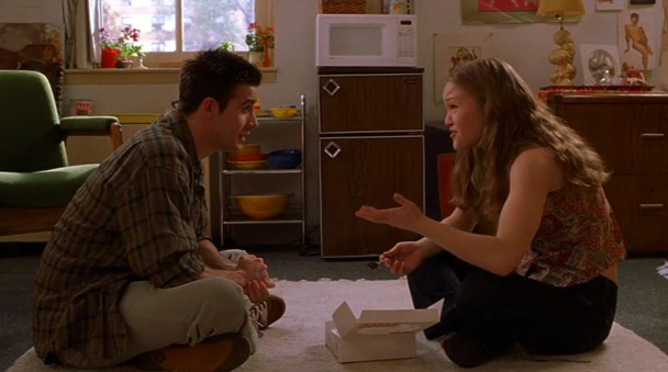 Woof. You know how it is when you go to a coffee shop and can't help but smile at all the couples in love because it reminds you of how you were in love in college one time? Also, if you could see the baggy-crotched dockers and wrinkled button downs that Freddie Prinze Jr. wears throughout this movie, he should not be talking about anyone's shoes. And it is all downhill from there. Here is when Freddie Prinze Jr. and Julia Stiles first meet. This is literally the SECOND scene of the movie: