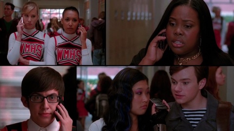 Schue, who's getting info on Sectionals moment-by-moment on Emma's live-blog (JK, they're on the phone), confronts Sue Sylvester for doing what he's know she did for weeks, and has already confronted her about at least twice. Basically, Sue gets a chance to have a funny line: "Bring it on, William. I am reasonably confident that u will be adding revenge to the long list of things you're no good at--right next to be married, running a high school glee club, and finding a hairstyle that doesn't make you look like a lesbian. Luv ya like a sista."