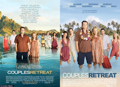 Couples Retreat, this fall's most thinly veiled paid vacation for Vince Vaughan and his friends, was already obviously terrible. We all know that. No one is wondering whether or not Couples Retreat, a nominal "comedy" in which three unhappy couples go to Hawaii for almost no reason other than that the stars of the movie wanted to go to Hawaii, is unfunny and miserable, much like the characters' marriages. But somehow this movie has managed to get even worse now that the token black couple has been Photoshopped out of the movie poster in the UK's marketing push. From the Mail:
