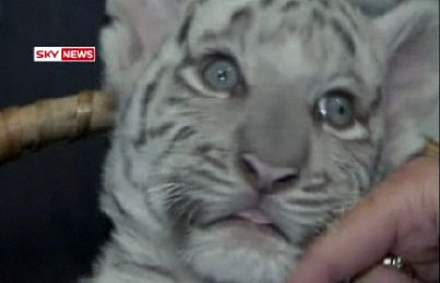 A German zoo has released the first video of a new baby white tiger cub born there 8 weeks ago with a genetic defect that caused it to be born with stripes. The zoo has kept the tiger's birth a secret until now "due to the unlikelihood of its survival." :( :( :(! But it seems...okay...now. Well, you decide. It's kind of a...spaz. It's special. It's a very special tiger that will teach its handlers about patience and unconditional love, until one day when it eats them by accident because it thinks they're Skittles.