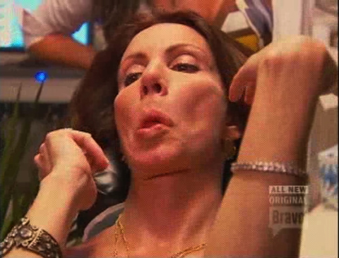 Meanwhile, Danielle, who is the Kelly Bensimon of New Jersey, if Kelly Bensimon had a FRANKENSTEIN FACE and was more open about her complete inability to keep her raging self-esteem issues in check, has a spa day. A spa day is when other Housewives as well as a Housewives camera crew come to your house and sit in a row of hard-backed chairs in a dark-paneled room and watch while one-by-one a doctor injects poison into everyone's faces. You know, relaxing spa stuff.