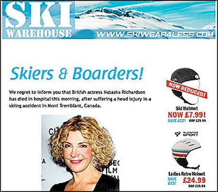 An email newsletter from English ski-wear company SkiWear4Less (or Ski Warehouse? definitely ski something) has been banned by the U.K.'s Advertising Standard's Authority, whatever that means, for including Natasha Richardson as a bid to sell more ski helmets. Huh. It is weird that a discount retailer did something that was not classy. From E! (the world's finest and apparently only news source) via FilmDrunk: