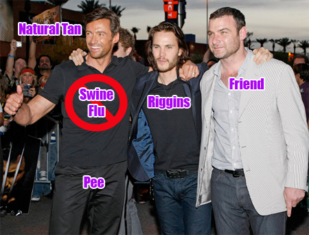 Although the swine flu scare definitely seems like overblown media-fueled panic at this point, I'm glad to see that in this one instance, Hugh Jackman did not let the actor in him take over. Better safe than sorry. Wet, and piss-scented, and safe. (Thanks for a similar tip, Gonzalo. Image via HuffingtonPost.)