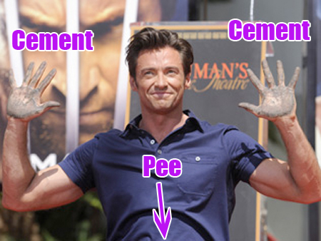 This morning, Hugh Jackman, star of Wolverine: Origins and pee-er of his own pants, was granted one of Hollywood's highest honors: immortalizing his foot and handprints in cement in front of the historic Grauman's Chinese theater. Reported the Australian Associated Press: