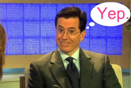 After a delightful interview promoting his role in Monsters And Aliens, in which Stephen wished harm upon Matt Lauer ("Every year I get this thrill of excitement when I think maybe you've lost Matt Lauer") and ridiculed Meredith for suggesting he was an egomaniac ("Have you seen my show? Have you been listening to this interview?") But the best part was the only part NBC edited out of the interview before putting it online: the end, when, in preparation for the next dumb segment about Twitter, Meredith asks Stephen if he's ever Twittered and Stephen smiles an impish grin and says "I've twatted.":