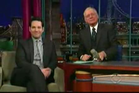 The debonair Paul Rudd was a guest on Letterman last night, and once again it was clear Dave really likes Paul. Their budding bromance was obvious as Paul told a story about trying to act tough in his early auditions, and a carefully-worded anecdote about the time Henry Kissinger caught him furiously pretending to jerk off to entertain a friend at a party. But the best part was when Paul's friends dared him to say the phrase "the debonair Henry Kissinger" in a Role Models-promotiong interview on a European TV show, and Dave showed the clip.