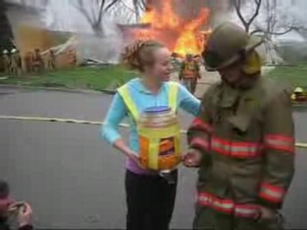 Kudos to the makers of this video for making the only comedy-song-based YouTube video I've ever watched until the end, but it had more to do with trying to figure out what the HELL this is about: there's a chick running around with a giant cheeseball dispenser strapped to her, giving "one cheeseball at a time" to the homeless, people on planes, and, most wtf-ly, people whose house was burning down at the time. There's no explanation of why, except to make people laugh, but this is a lot of kind of meaningless effort to make people laugh: