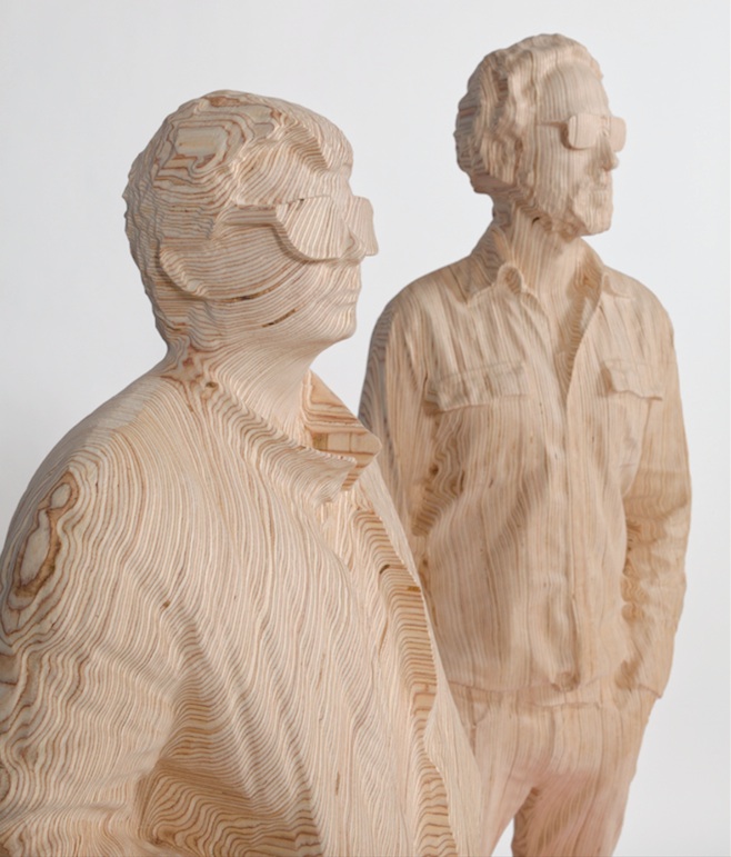 The members of Daft Punk are so protective of their robotic stage personas that it was big news, a couple of years ago, when a surreptitious shot of the out-of-costume duo appeared on Facebook. But apparently, Daft Punk are willing to relax that protectiveness if you're willing to sit there and make a damn sculpture of the two of them. For a new exhibit, the sculptor Xavier Veilhan has crafted a series of sculptures called The Producers. For that series, he's crafted plywood likenesses of a number of music titans, including Quincy Jones, Giorgio Moroder, Lee "Scratch" Perry, Rick Rubin, the Neptunes, Nigel Godrich, and Philippe Zdar. And he also got full cooperation from Daft Punk, who let him make 3D scans of their unhelmeted faces. (They're still wearing sunglasses, though, so we don't get to see what their plywood eyes look like.) Here's Veilhan, explaining how this happened: