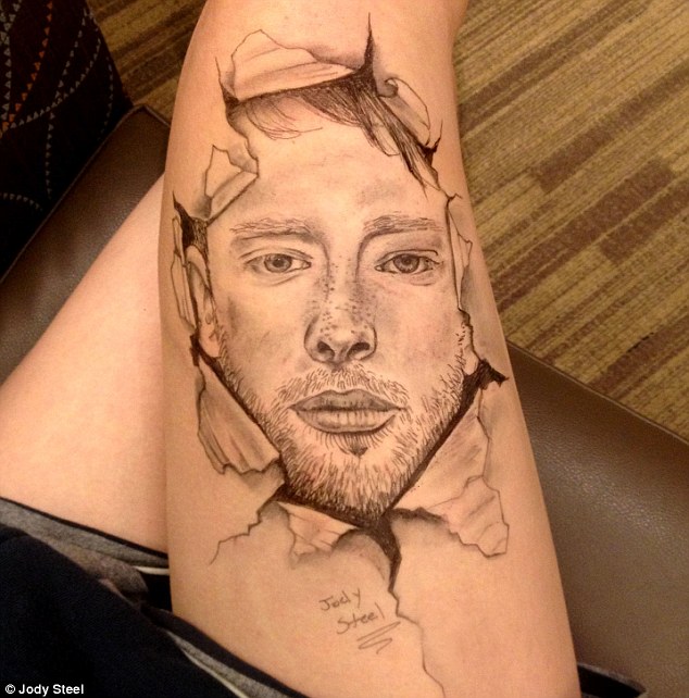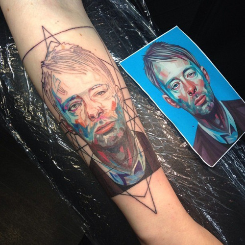 It is often said that replicating a human face to look realistic is one of the greatest challenges presented to a tattoo artist. It's hard enough to render an accurate portrait on paper or canvas, but doing so on flesh is nearly impossible. So, when you're looking to devote a piece of yourself to Thom Yorke's face, it's smart to embellish it somehow, make it memorable. This isn't a portrait of your nana we're talking about; this is the frontman of Radiohead. There are many Radiohead devotees who have committed impressive amounts of skin to cover art imagery and lyrics...