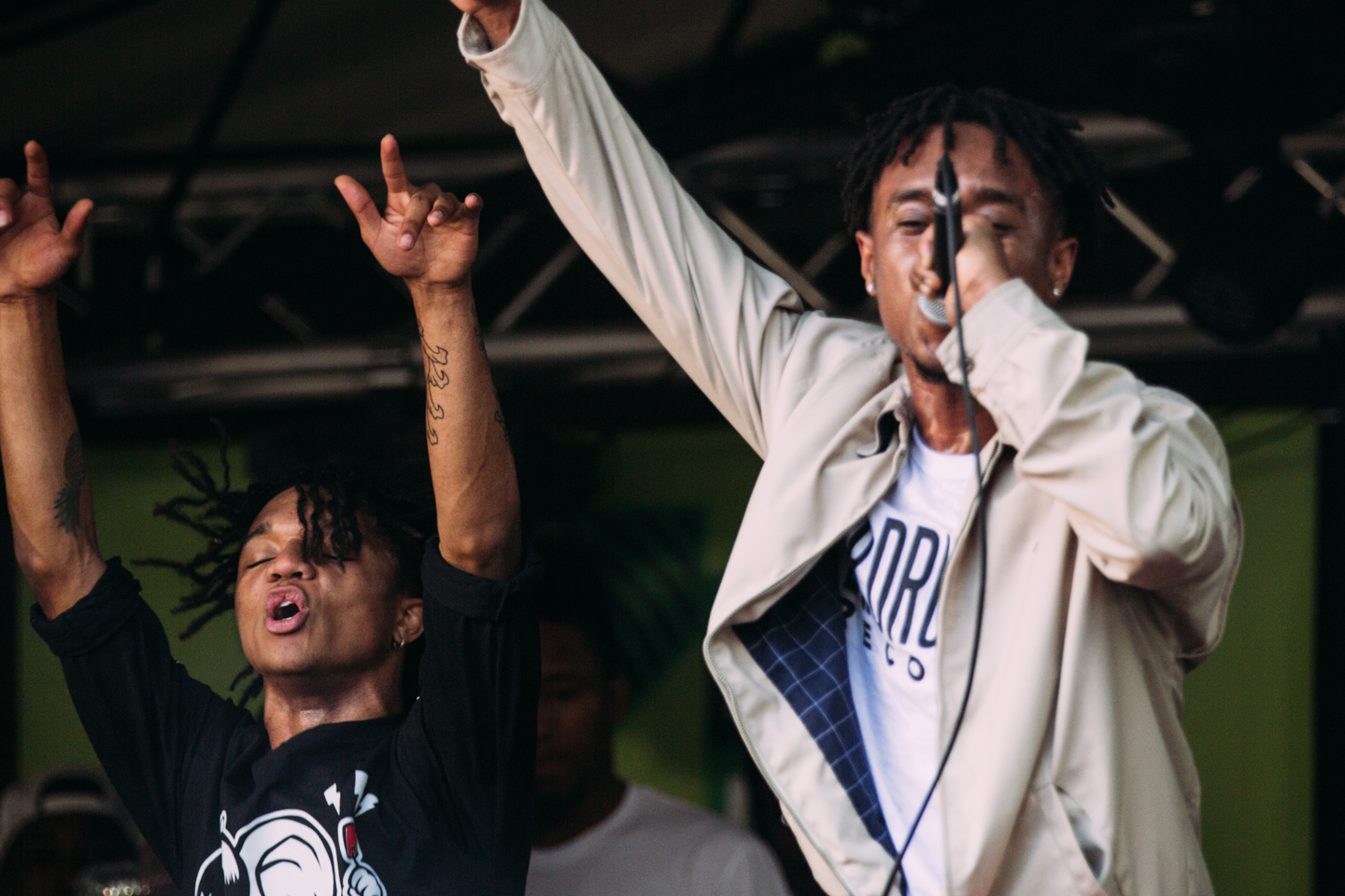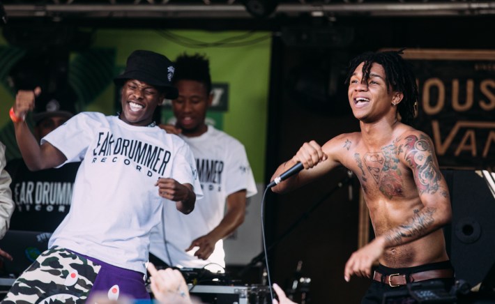 There's something to be said for hedonism, for unabashedly glorying in your own desires, for recklessly pursuing the present. In a moment when rap has turned its face toward the social justice issues that plague society, Rae Sremmurd are looking squarely in the mirror. And they like what they see. Slim Jimmy and Swae Lee jumped onto the Mohawk stage yesterday in the early evening, jumping and bouncing against each other like lottery balls on a lucky streak. Two huge cut-out heads bobbled behind them, contributing to the cartoonish, carefree atmosphere. "No Flex Zone" was the obvious opener, but it was the sea of X-marked hands on underage kids arching toward the stage that greeted their flexing. Above decks, on the balconies full of your standard SXSW badge holders, awkward silence hung thick. The occasional zealous fan who'd opted to watch above the fray could be heard, but most looked on in amusement or slight confusion: They have yet to be enlightened to the SremmLife.