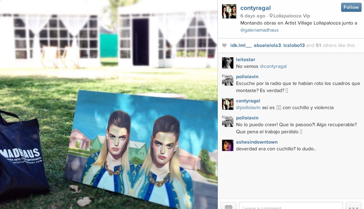 On Saturday, St. Vincent played the Chilean edition of the Lollapalooza festival. And when she was there, she got herself into some trouble, allegedly because she destroyed paintings that were in the dressing room. The paintings in question were the work of the Chilean artist Constanza Ragal Chaigneau, and as MTV points out, La Tercera reports that the artist demanded $4,500 from Annie Clark. Chaigneau claimed in an Instagram comment (below) that the paintings were destroyed with "knives and violence," so Clark must've really hated those things!