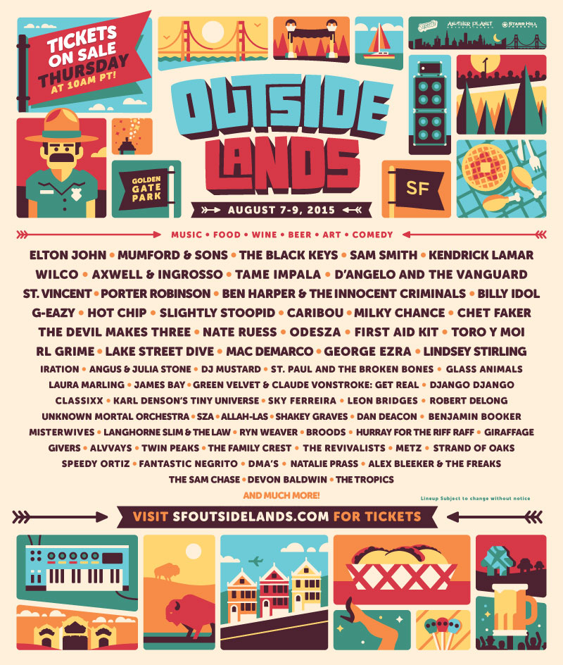 Outside Lands has just announced the lineup for the eighth iteration of the San Francisco-based festival. This year's headliners are Elton John, Mumford & Sons, and the Black Keys, and other top draws include Sam Smith, Kendrick Lamar, Wilco, D'Angelo And The Vanguard, and St. Vincent. The rest of the lineup is made up of names both big and small, including Porter Robinson, Billy Idol, Hot Chip, Caribou, Toro Y Moi, Mac DeMarco, DJ Mustard, Glass Animals, Laura Marling, Classixx, Sky Ferreria, Unknown Mortal Orchestra, SZA, Dan Deacon, Ryn Weaver, Giraffage, Alvvays, Twin Peaks, METZ, Strand Of Oaks, Speedy Ortiz, and Natalie Prass. That's a lot of good artists! This year's festival will take place at Golden Gate Park from 8/7-8/9, and tickets go on sale on 3/26 at 10AM PST. Full lineup is below after a very fun teaser video starring Lauren Lapkus.